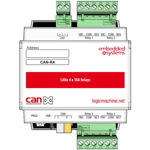 Typ: Embedded Systems CAN-R4 CANx Modul výstupov 4 x 10 A - s tlačidlami manuálneho ovládania Na uvedenie do prevádzky a prepojenie s inými protoko...