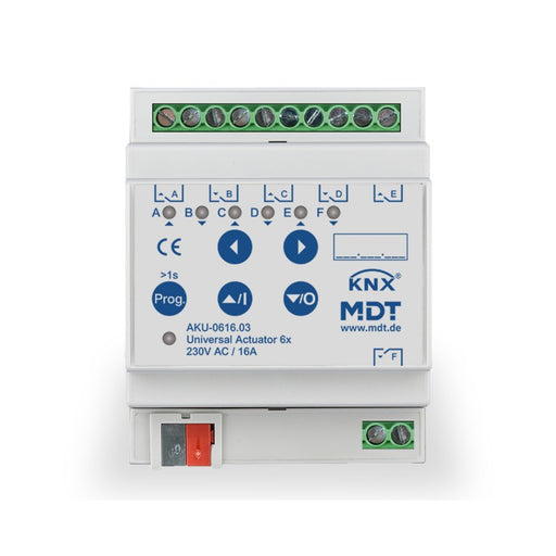 Type : MDT AKU-0616. 03 Actionneur universel 6x/16A EAN : 4251916130428 Système de bus : KNX (TP) Degré de protection : IP20 Le moteur universel M...