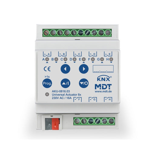 Type : MDT AKU-0816. 03 Actionneur universel 8x/16A EAN : 4251916130442 Système de bus : KNX (TP) Degré de protection : IP20 Le moteur universel M...