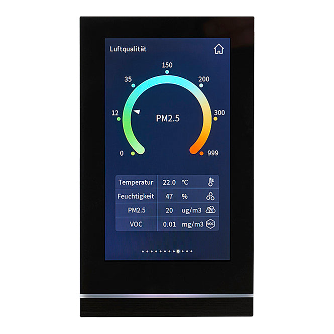 - s až 10 zobrazovacími stránkami pre externé senzory cez KNX: teplota, relatívna vlhkosť, PM2,5, PM10, CO2, VOC, AQI, jas a rýchlosť vetra