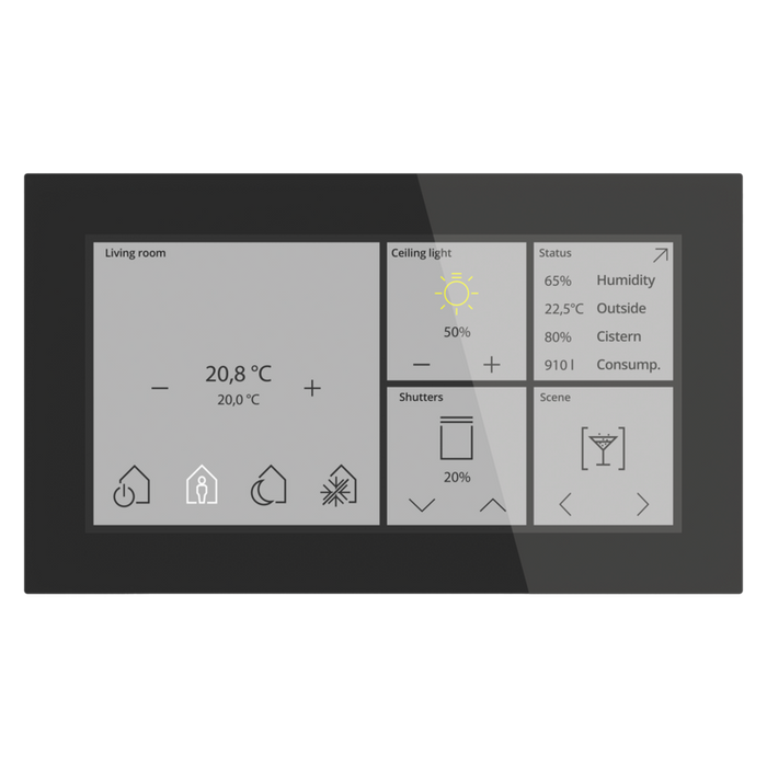 Horizontálne aj vertikálne montovateľný 6-palcový displej je možné individuálne rozdeliť pomocou ETS a prispôsobiť farbami, logom alebo obrázkom na pozadí. Moderný dizajn Glass Touch Smart dopĺňa orientačné svetlo po celom obvode. Vďaka až 64 funkciám je možné zobraziť až 12 stavových displejov na jednotlivých úrovniach. Tlačidlo je vybavené teplotným senzorom a regulátorom izbovej teploty pre režim vykurovania a chladenia.